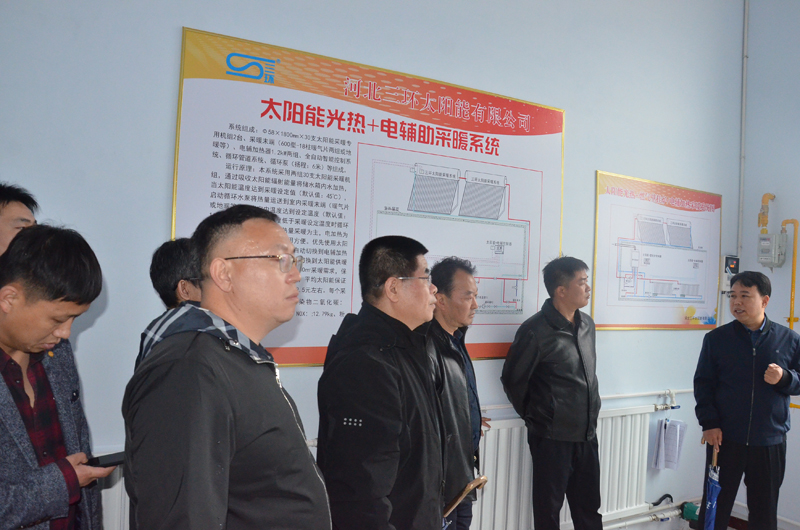石家莊市雙代辦領導在我市雙代辦主任張利海的陪同下蒞臨我三環(huán)公司,考察太陽能采暖模式。我公司張董事長及副總經(jīng)理趙東平全程陪同。我河北三環(huán)公司所開發(fā)的太陽能+電輔助及太陽能+壁掛爐采暖系統(tǒng)受到眾領導一致好評!